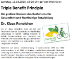 Dienstag, 17. April, 19 Uhr: Club 4, 1010 Wien, Stephansplatz 4: Das "Triple Benefit Principle"Das "Triple Benefit Principle" Praxis-orientierter Vortrag mit zahlreichen Bildern Veranstalter: ARGE Schöpfungsverantwortung |