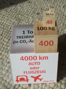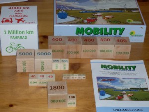 THE EDUCATIONAL GAME ON CLIMATE-FRIENDLY MOBILITY consists of so-called iso-emission-cubes in different sizes. The cubes represent a certain quantity of green house gases (GHG in CO2 -e )from 1kg to 1 ton. Each of the 6 sides of a cube represents another means of transport and the numbers in different colours explain how far you can travel with a plane, car, hybrid car, train, bicycle etc. till you have produced the amount of GHG the cube is representing.